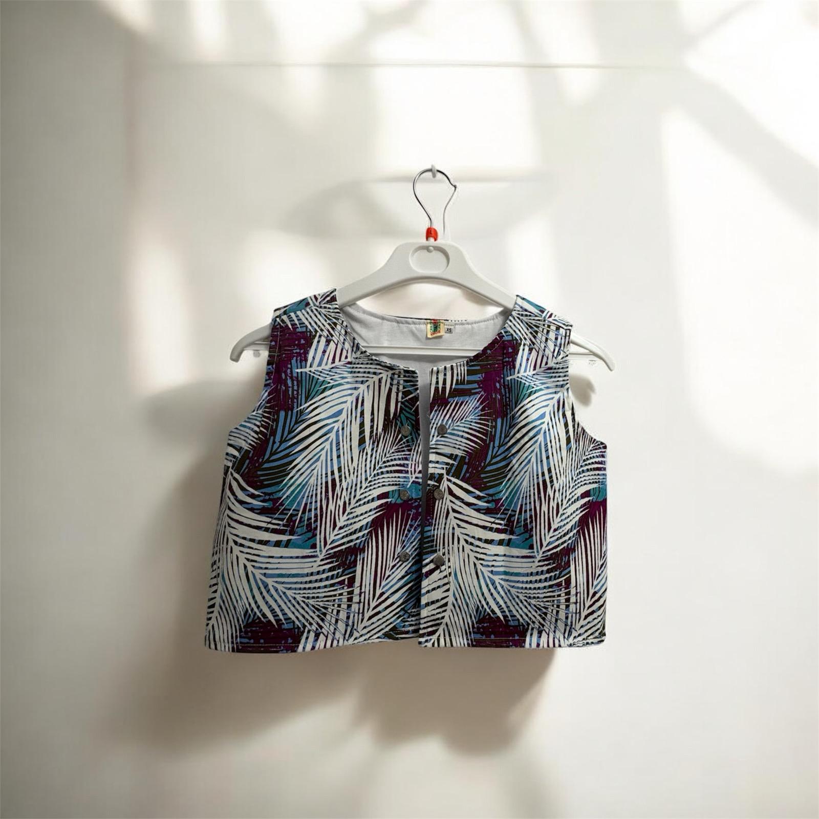 Chaleco para niña con estampado tropical lleno de color. Ligero, cómodo y versátil, ideal para aportar un toque artístico y diferente a cualquier look.