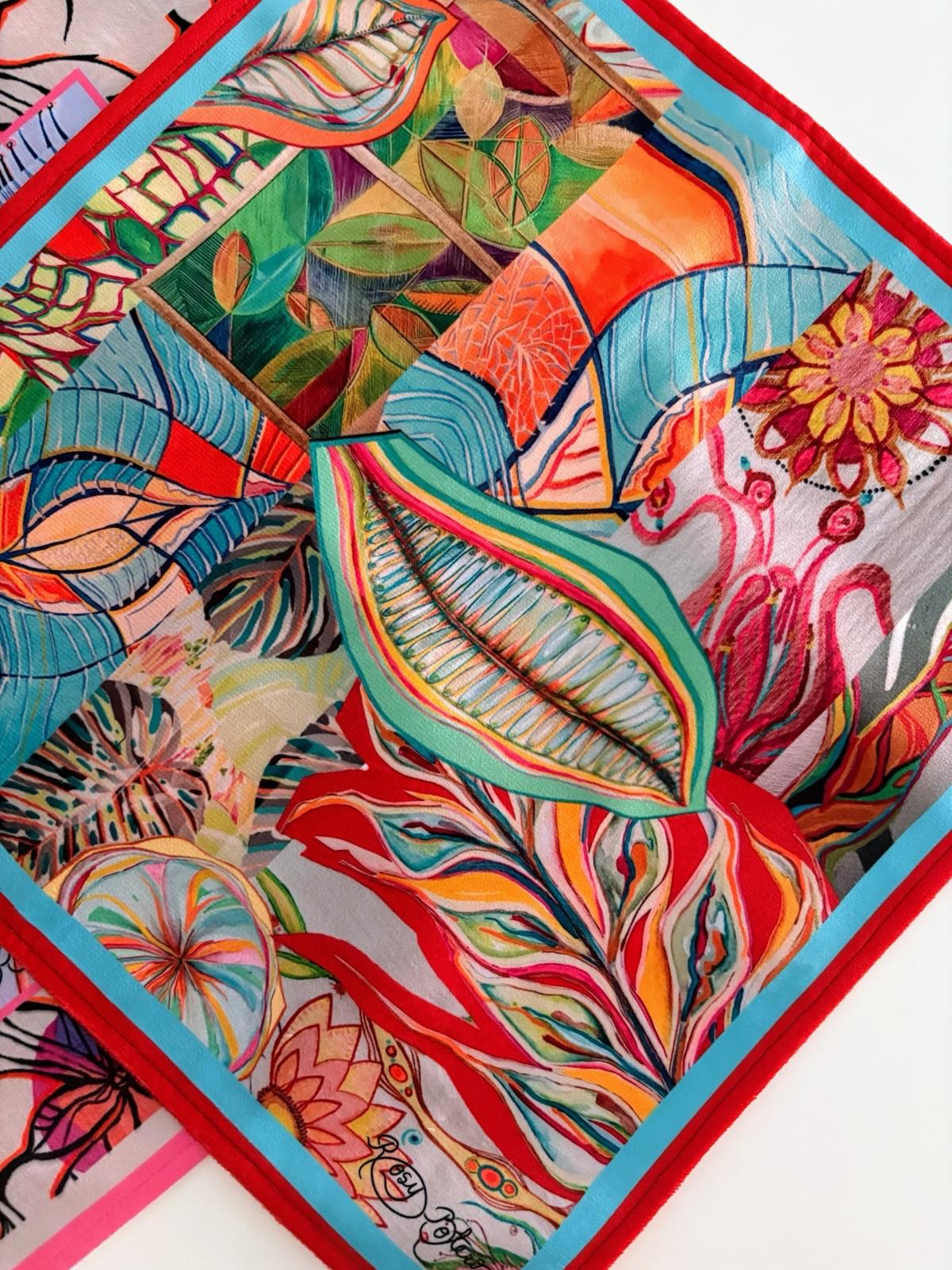 El individual Aroma Naturaleza nace de un boceto inspirado en las formas orgánicas y la energía del trópico. Su diseño floral, lleno de movimiento y contrastes, refleja la esencia viva del Caribe.
