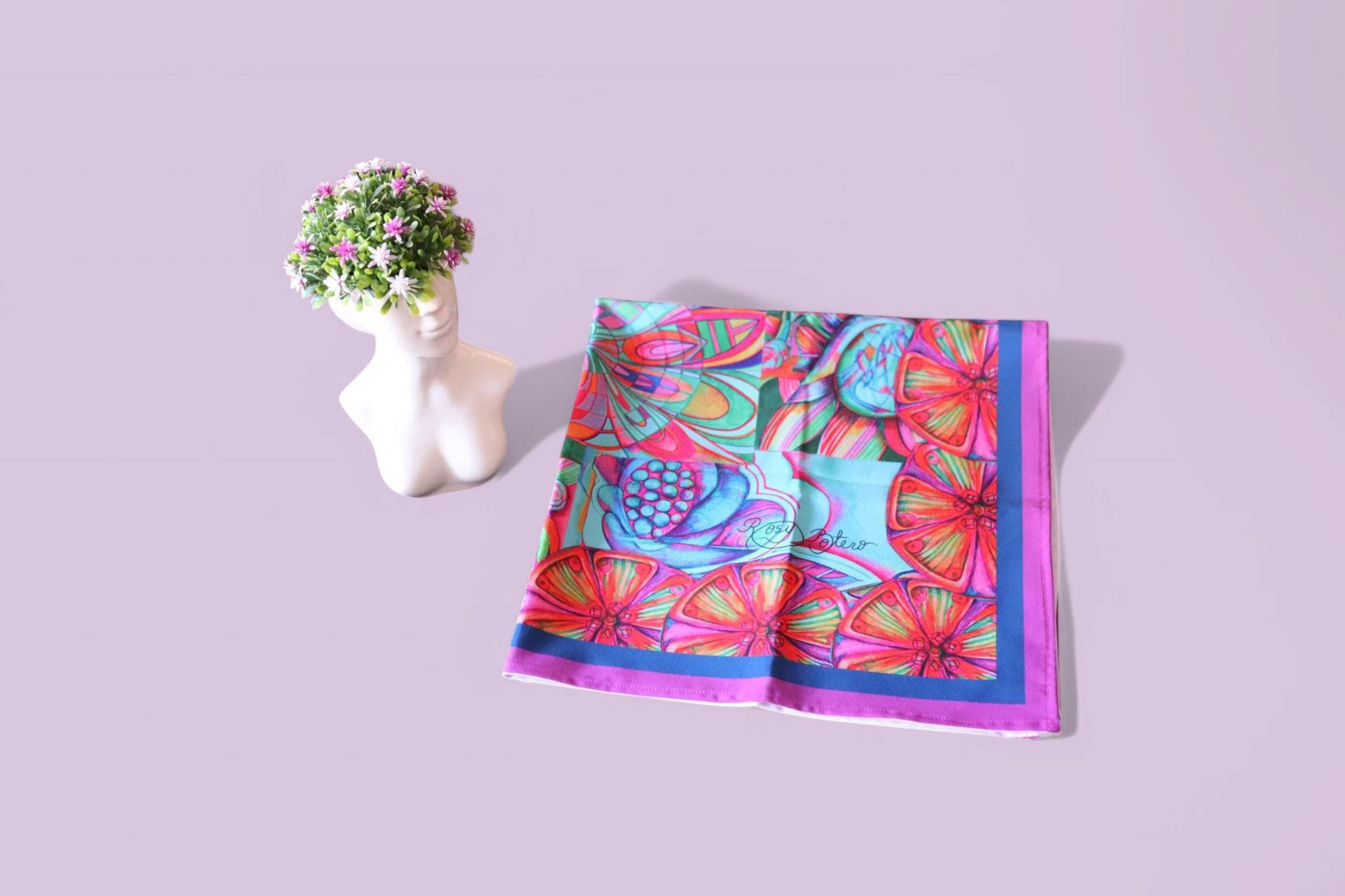 Este hermoso pañuelo de 70x70cm está confeccionado en seda mango de alta calidad, con un diseño exclusivo Aire Primaveral que captura la frescura y delicadeza de la primavera con motivos suaves y colores vibrantes.