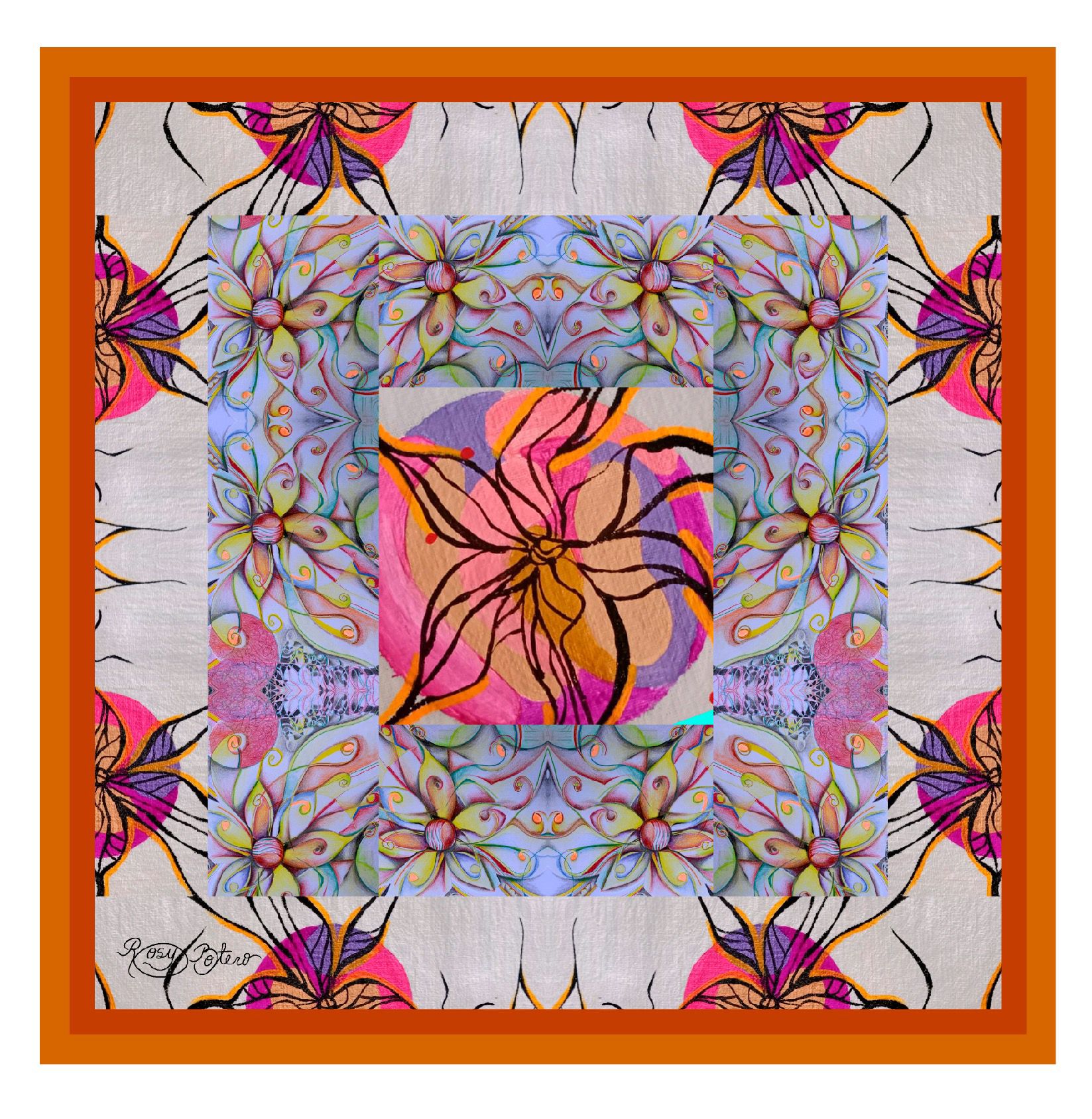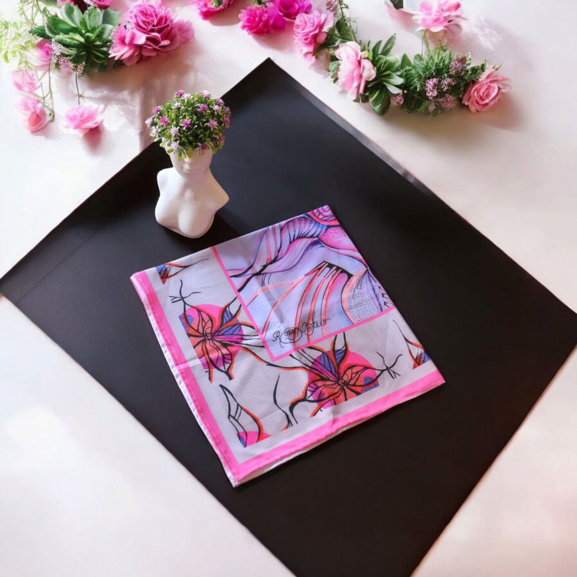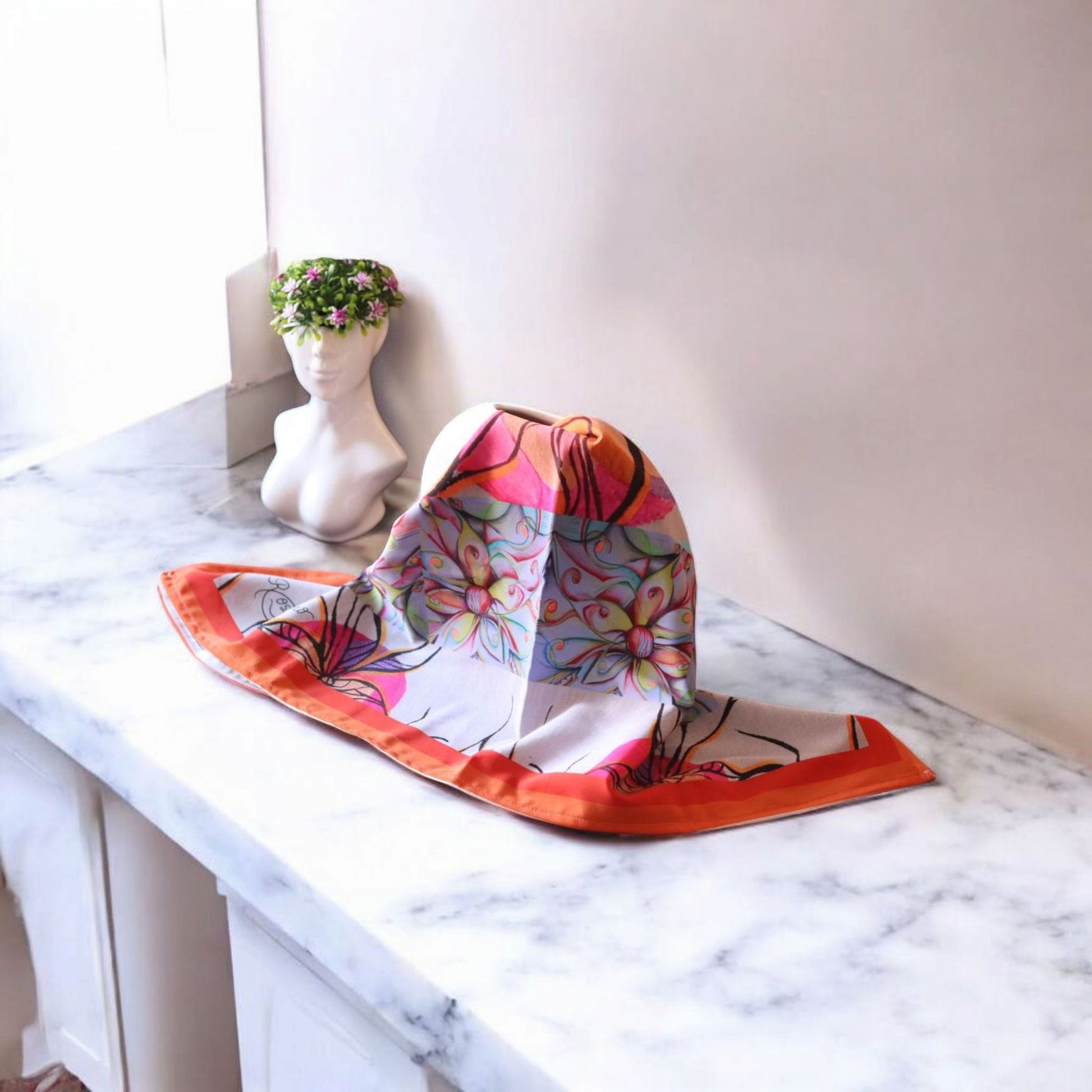 Este hermoso pañuelo de 70x70cm está confeccionado en seda mango de alta calidad, con un diseño exclusivo Entorno Espiral que presenta patrones geométricos en espiral, creando un efecto visual único y moderno.