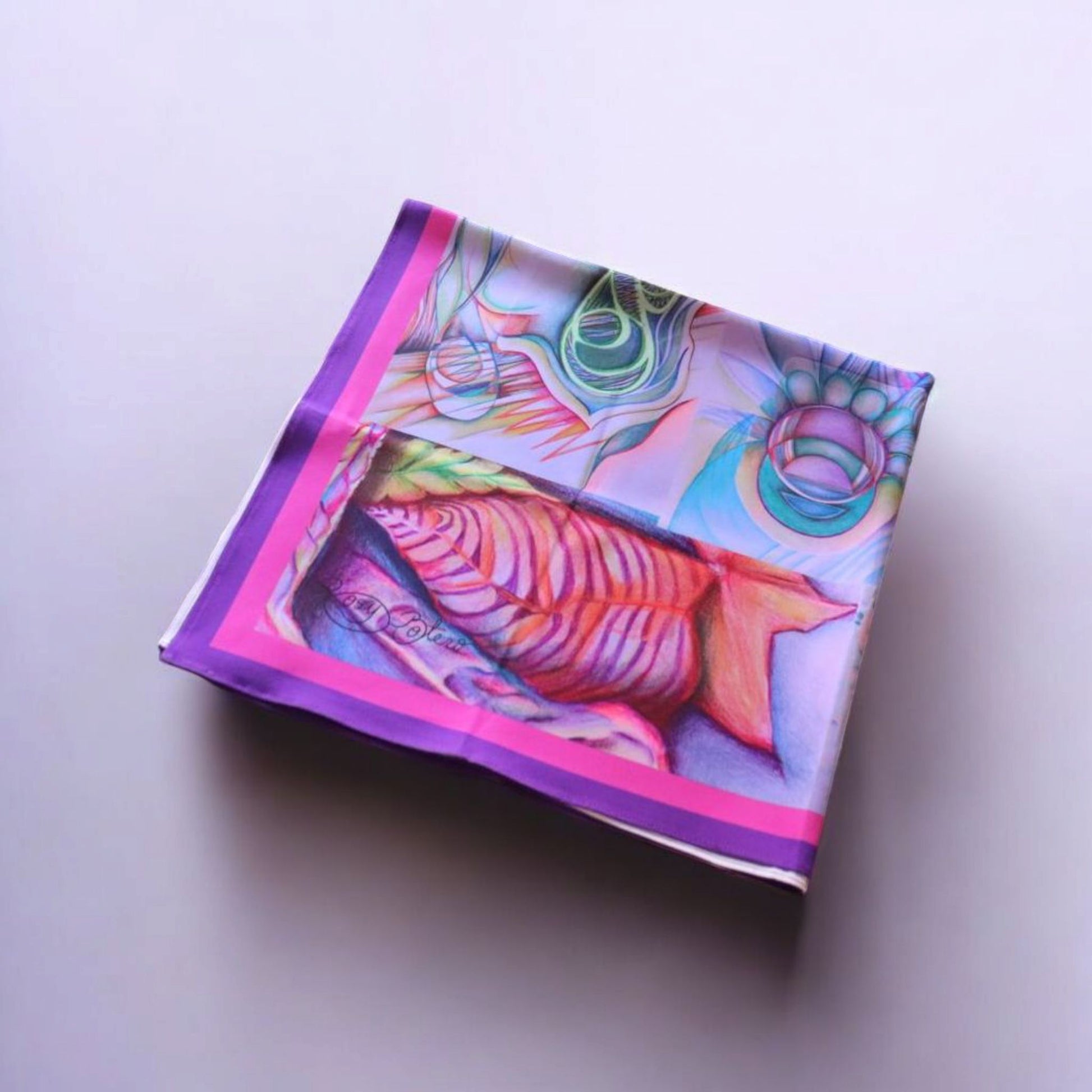Este hermoso pañuelo de 70x70cm está confeccionado en seda mango de alta calidad, con un diseño botánico exclusivo inspirado en especies naturales que aporta elegancia y frescura a tu estilo.
