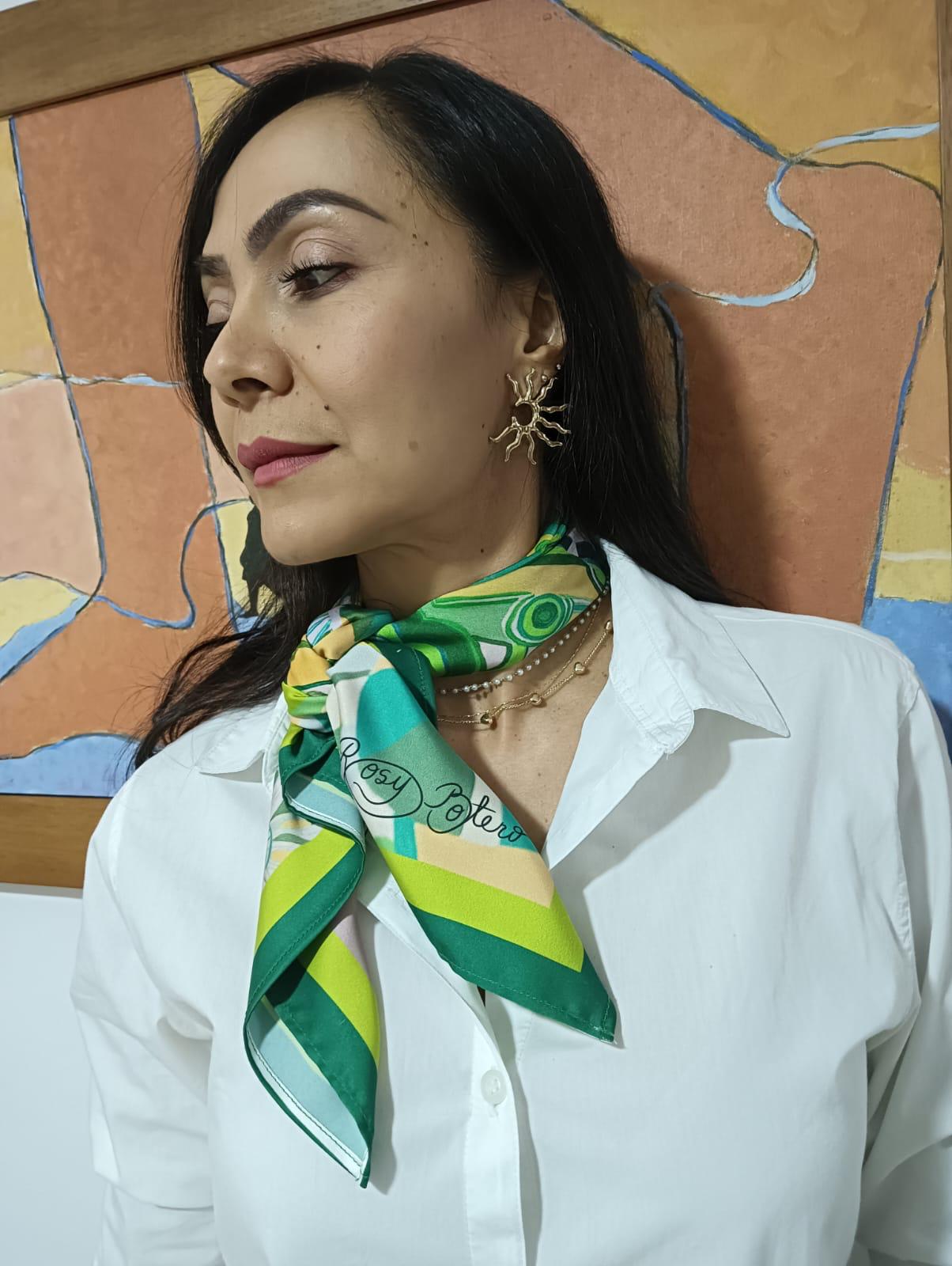 Este hermoso pañuelo de 70x70cm está confeccionado en seda mango de alta calidad, con un diseño exclusivo Naturaleza Fresca que evoca la frescura y vitalidad de la naturaleza, creando un complemento perfecto para cualquier ocasión.