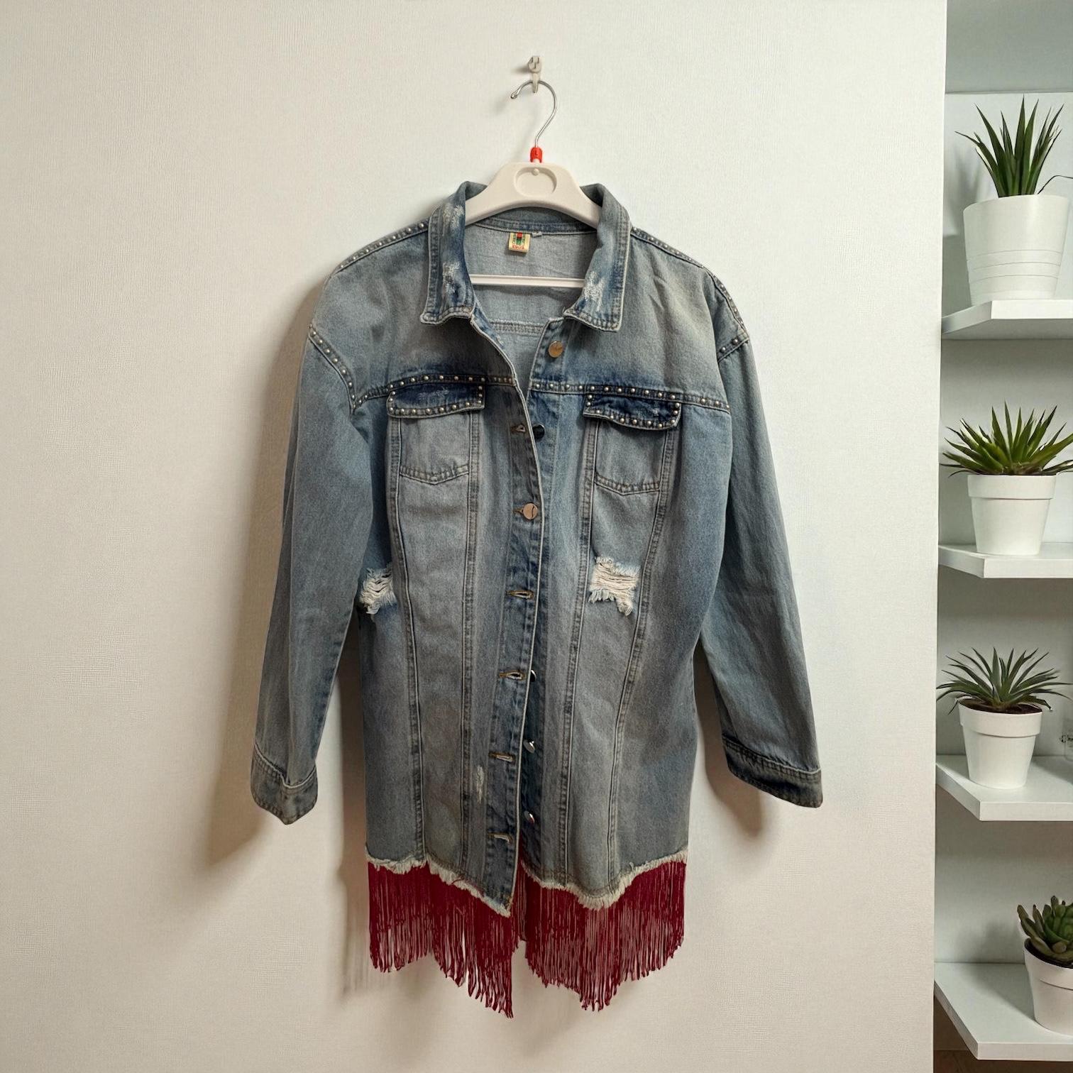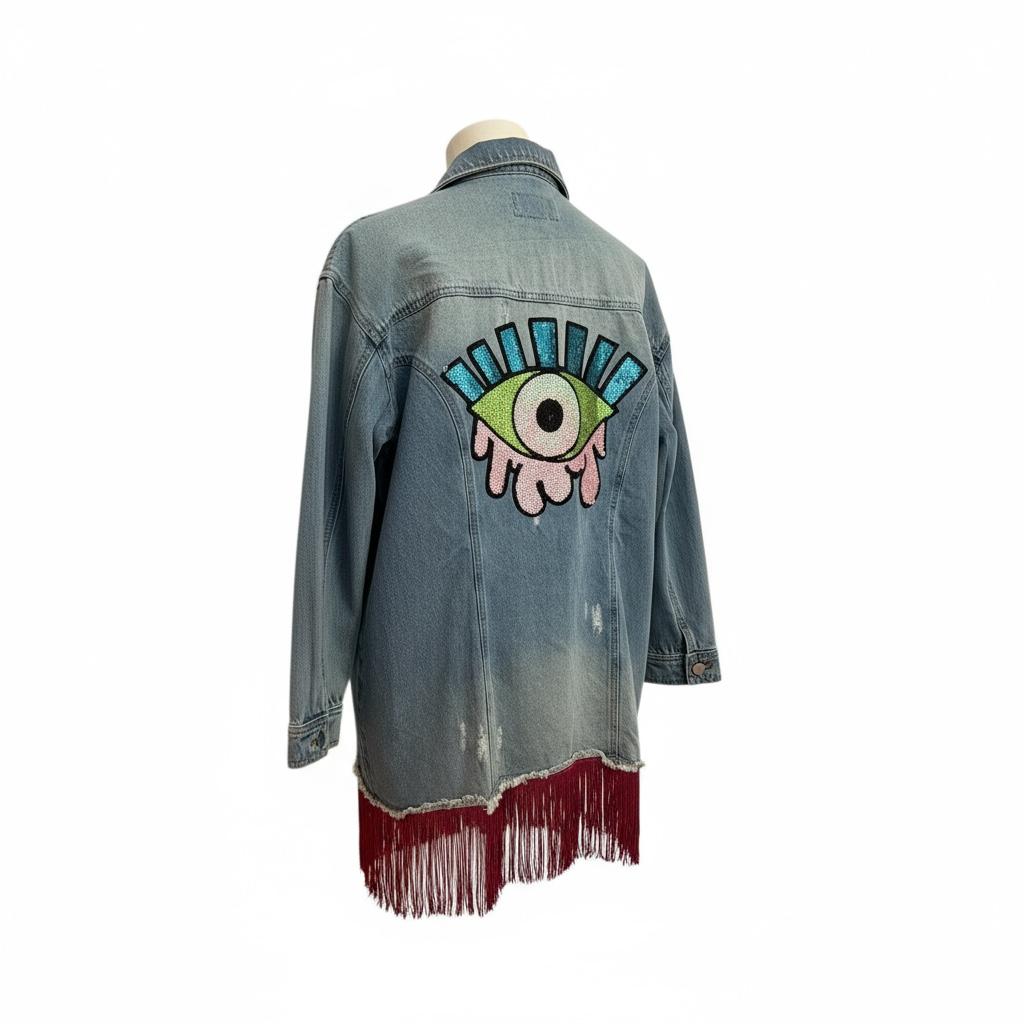 Chaqueta vaquera intervenida con arte, flecos y carácter único. Intervencion de diseño exclusivo